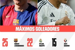 体育资讯4月1日讯 西甲官方预热了本赛季最佳射手的争夺,并公布了目前射手榜排在前六位的球员。 排行如下: 1、莱万(巴萨) 25球 2、姆巴佩(皇马) 22球 3、布迪米尔(奥萨苏纳) 15球 4、桑谢特(毕尔巴鄂竞技) 13球...