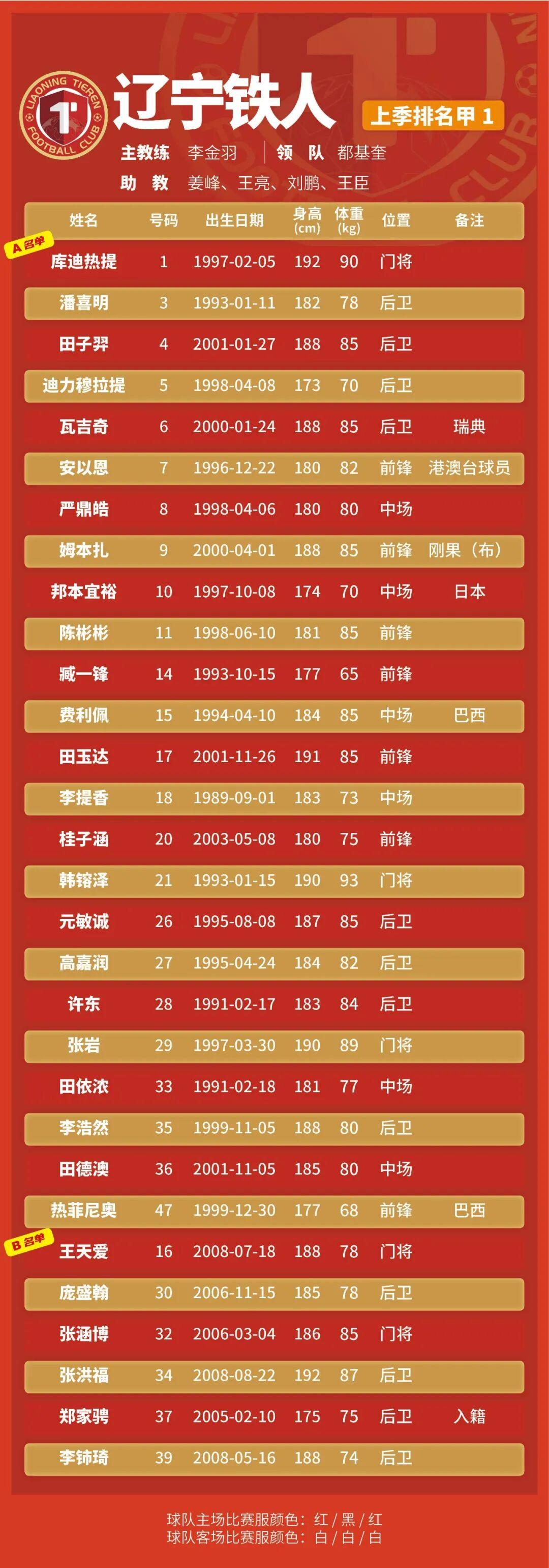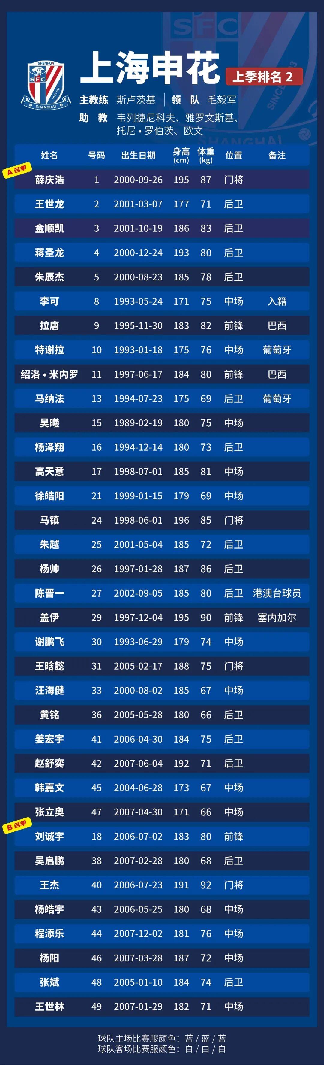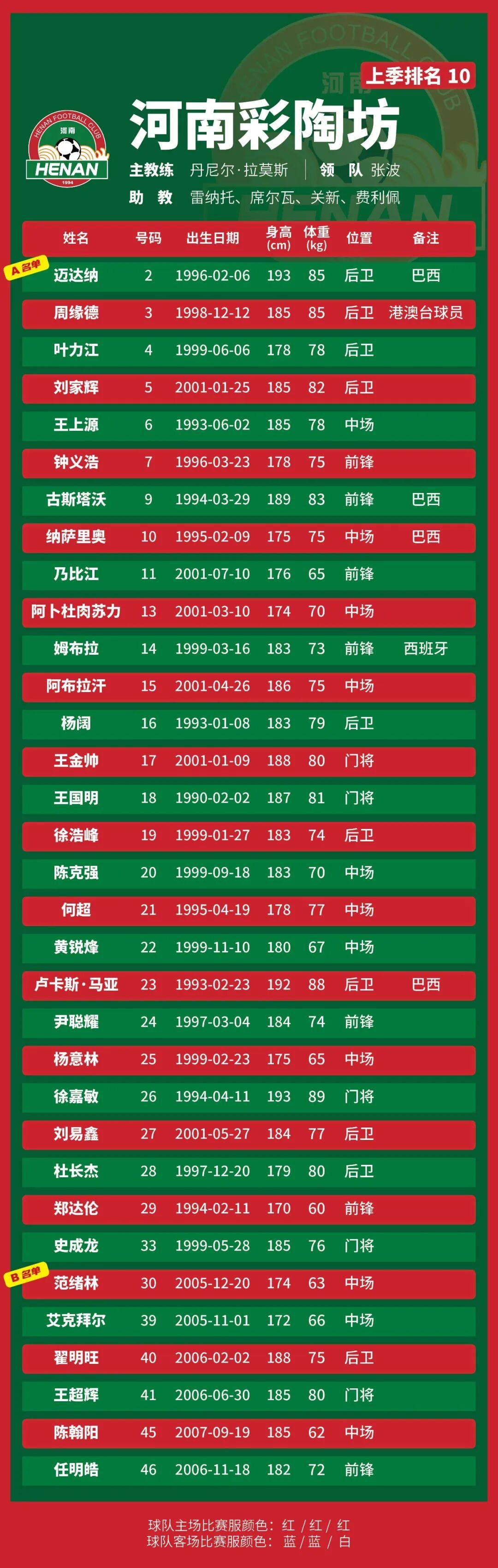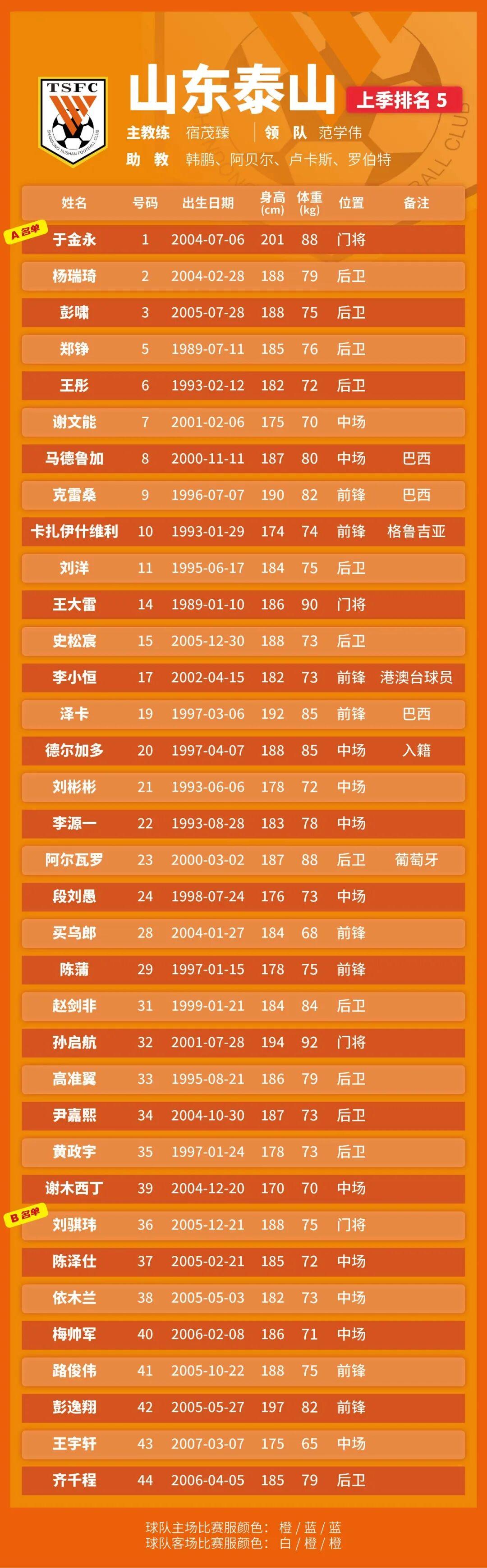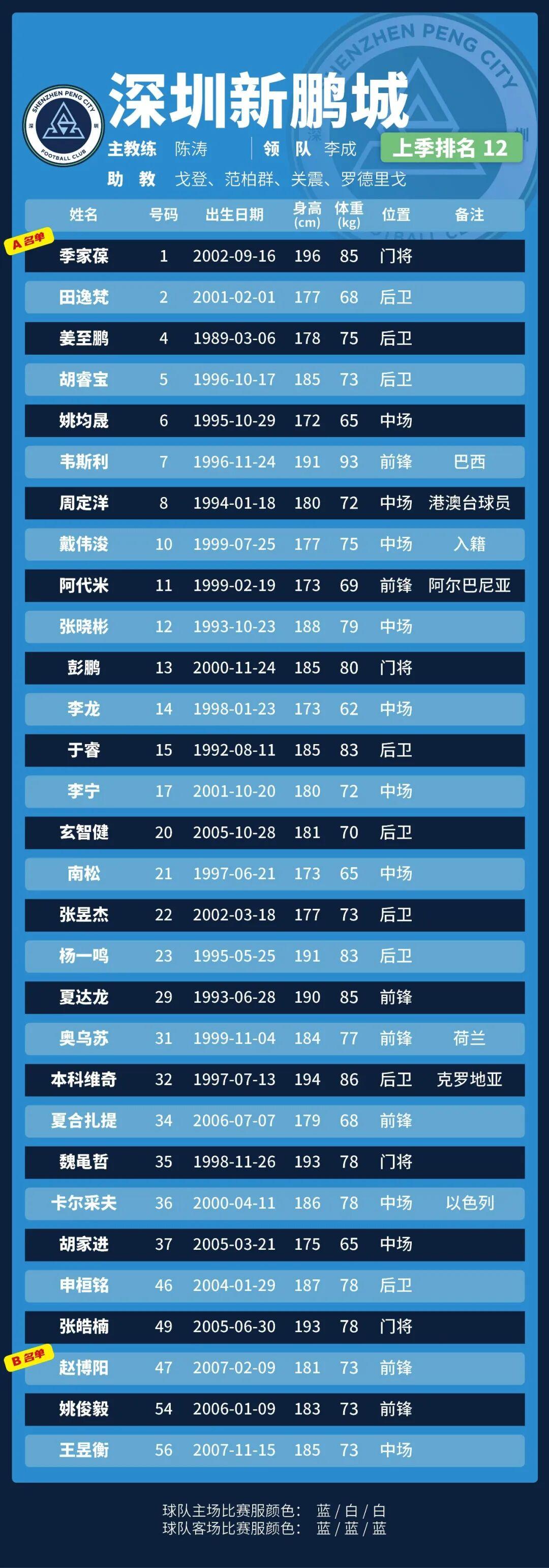 p.s.数据采用各队中超报名表登记内容,