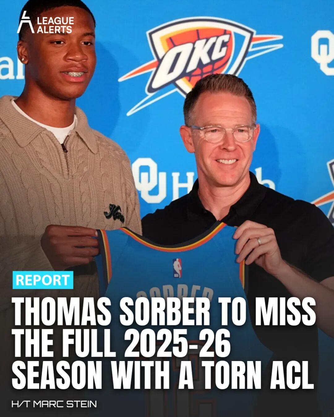 来自雷霆的一个不好消息。来自NBA记者Michael Scotto的报道,近日,雷霆新秀托马斯索伯在训练中遭遇了右膝前十字韧带撕裂(ACL撕裂),他将缺席下赛季的所有比赛。托马斯索伯是雷霆今年在首轮15顺位选中的新秀(恰好比杨瀚森高1顺位),目前19岁,来自乔治城大学,司职中锋,联合试训时...